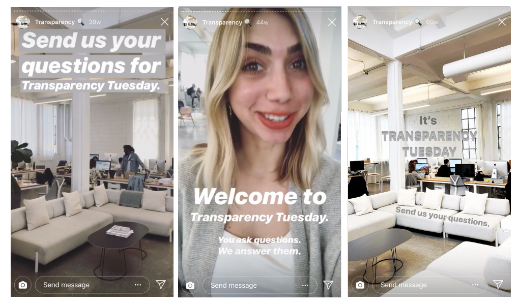 To make your calendar planning easy, think about creating Instagram Stories themes for different days of the week. Check out how like @Everlane has their regular Transparency Tuesday Instagram Stories posts:
