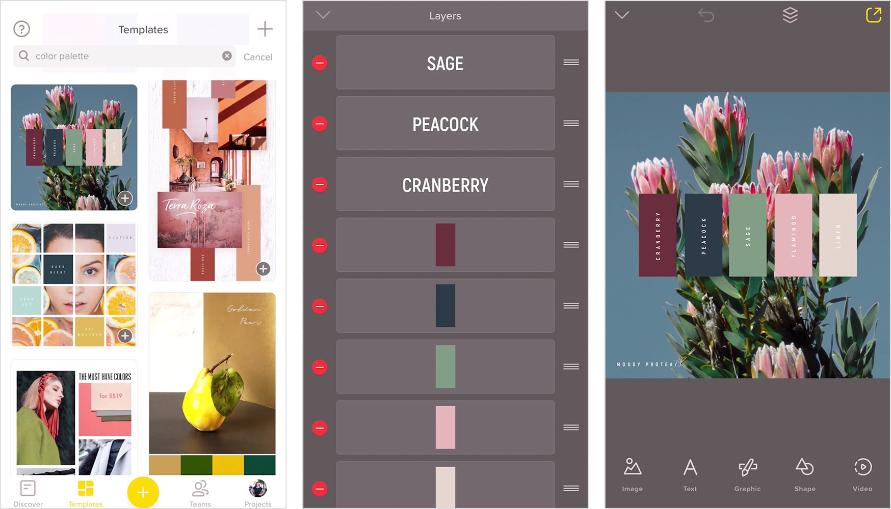 In the search bar in templates, search for a color palette. Over has created a library of color palettes based on current trends and brand styles, so when you see something you like, simply tap it to open it.